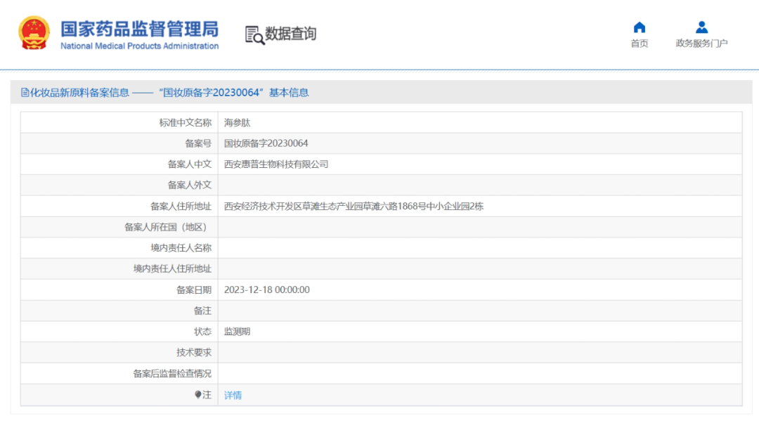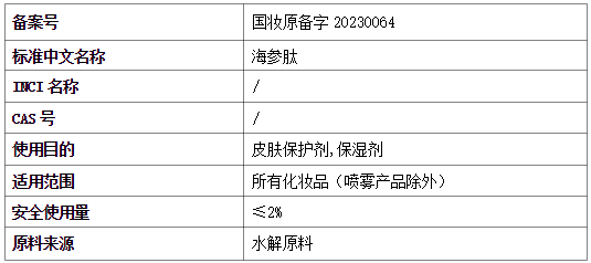 12月20日,惠普生物自主創(chuàng)新研發(fā)的化妝品新原料“海參肽”,成功通過國家藥品監(jiān)督管理局化妝品新原料備案(備案號:國妝原備字20230064)。