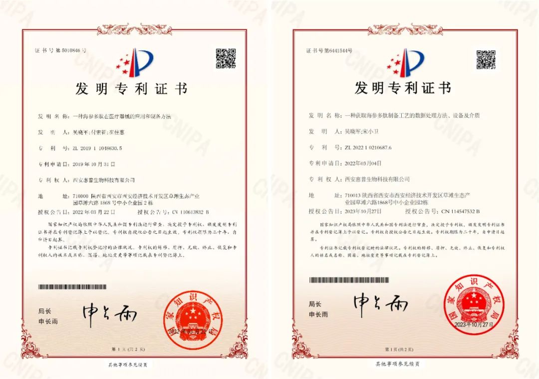 另一方面,惠普生物非常注重知識產(chǎn)權保護,充分發(fā)揮自身的創(chuàng)新研發(fā)優(yōu)勢,積極布局原料和平臺技術方面的專利,先后獲得了:一種海參多肽在醫(yī)療器械的應用和制備方法(ZL 2019 1 1048630.5)及一種獲取海參多肽制備工藝的數(shù)據(jù)處理方法、設備及介質(ZL 2022 1 0210687.6)兩項中國發(fā)明專利,這是技術革新中實踐和探索的結晶,而化妝品新原料的成功備案,可以說是惠普生物海參肽的第三個里程碑。